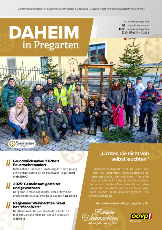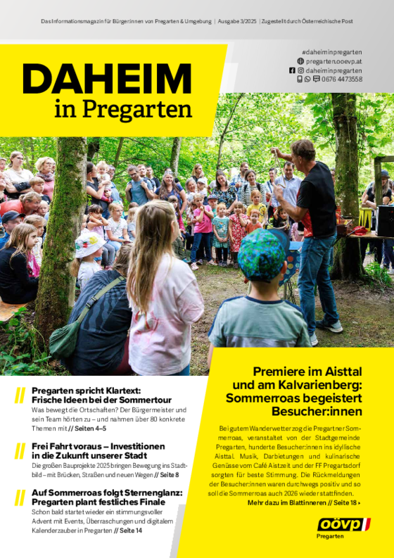 Unter dem Titel DAHEIM IN PREGARTEN erscheint mindestens vier Mal jährlich unsere Gemeindeparteizeitung. Mit viel Wissenswertem aus Pregarten und Umgebung. Die Zeitung wird per Post an alle Haushalte ohne Werbungsverzicht oder auch persönlich vom Team der OÖVP Pregarten zugestellt.